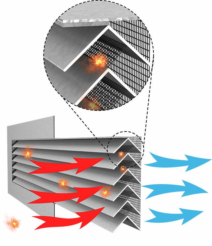 Fire Resistant Multi-Guard Louver Vents (MGV) are a critical part of securing buildings in wildfire-prone areas. Patented MGV style louvers are designed to match the usual 2” depth standard of louver vents. They are equipped with 1/16” galvanized steel mesh on the back, an internal filtration system, and intumescent elements for a critical temperature environment.